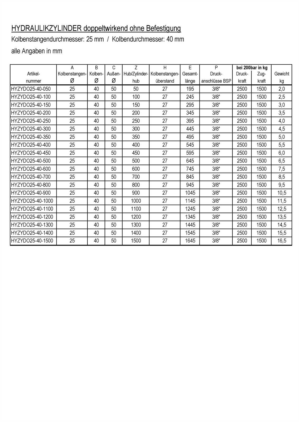 Hydraulikzylinder 25 40 1300 doppeltwirkend ohne Befestigung 40 25 1300